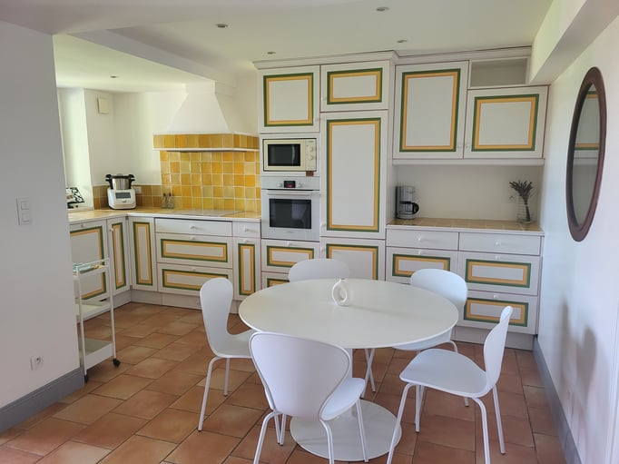 Lave-vaisselle, réfrigérateur/congélateur, four, micro-ondes, plaques vitrocéramiques, cafetière électrique, machine Nespresso, robot de cuisine, trancheuse, bouilloire, grille-pain, table et chaises.