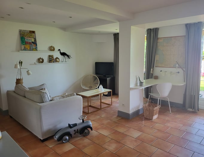 Séjour avec cuisine ouverte, canapé, fauteuils, télévision, coin bureau